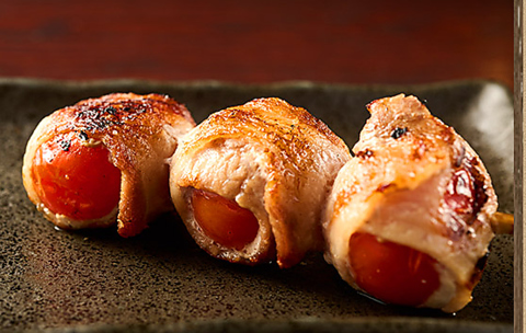 女性を中心に人気の野菜串は、種類豊富で選ぶ楽しさも魅力。中でも豚肉で巻いたミニトマト巻は、鮮やかな彩りとジューシーな味わいがたまらない一品です。