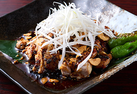 鶏もも肉に辛口のソースを絡めたピリ辛もも肉竜馬焼きも、ぜひお試しを。ラー油の辛味とフライドガーリックの香りで、お酒が進むこと間違いなしです!
