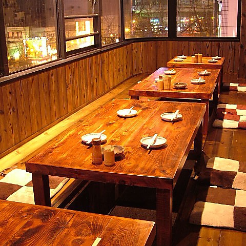 木のぬくもりを感じられる店内。最大20名様までご利用いただける掘りごたつ席で個室宴会が可能です。全席喫煙OK