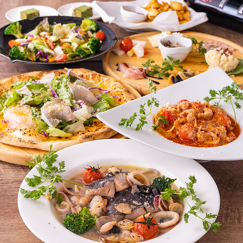 デートや女子会、お仕事帰りにサクッと飲み会も大歓迎です!見た目も華やかな前菜盛り合わせやワインがすすむ旨味が溶け込んだアヒージョ、シェアしやすく女子会にピッタリのピザなど一品料理も種類豊富にご用意しております!