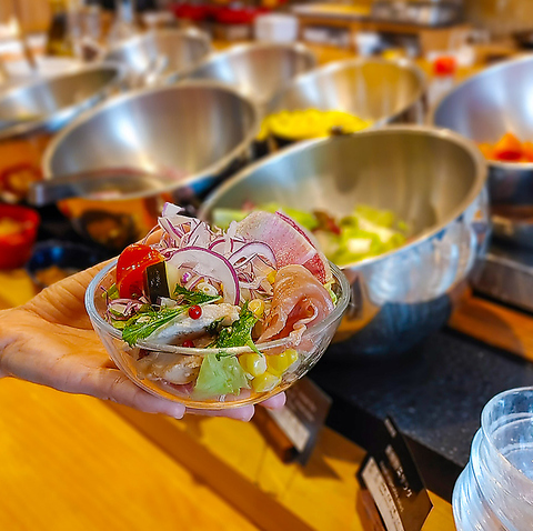 とれたて高知野菜のサラダ、土佐ジローの卵、土佐沖どれ干物、こだわりブレンド米、和・洋 20種類以上。