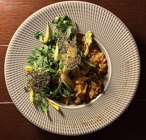 『春菊と白菜のソテー、辛い牡蠣ラグーのリゾット』