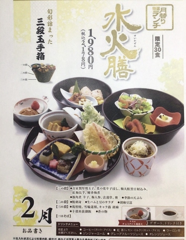 前日までの予約で!【月替特選ランチ】水火膳は1日30食限定2178円です!ドリンク、デザート付き!