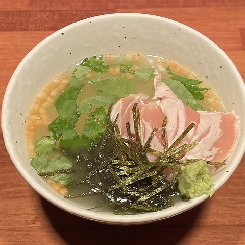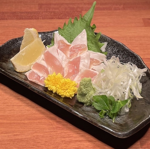 当店が使用するのは厳選した地鶏、甲州健味鶏です。肉の旨みが濃い、軍鶏だからこそ味わえる一品。わさび醤油でシンプルに。軍鶏本来のコクと弾力をお楽しみください