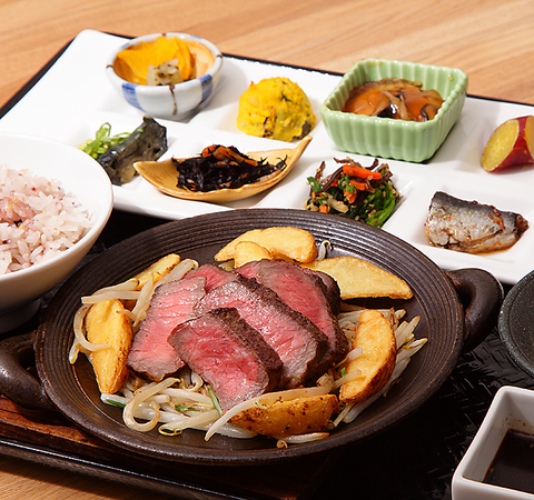 ランチは京都を感じるおばんざい八寸+メインの、おばんざいステーキランチ!自家製蒸し上げ豆富が食べ放題