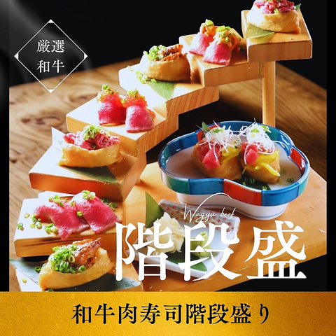名物の和牛肉寿司と創作スシの階段盛り!