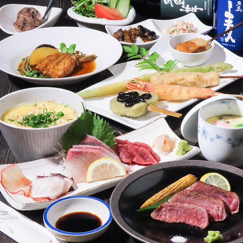 小鉢2種やお刺身、本日のお造りなど、贅沢な料理が詰まったコースです。じゃがいもカリカリサラダや串揚げ5種など、バラエティー豊かな一品も楽しめます。ミニ茶碗蒸しや本日のお肉料理焼き物/煮物も絶品です!あったかい素麺で〆て、デザートで甘いひとときを楽しんでください。歓送迎会やお祝いに最適なコースで、120分の飲み放題も付いて大変オトクです1名様からのご利用も可能です♪