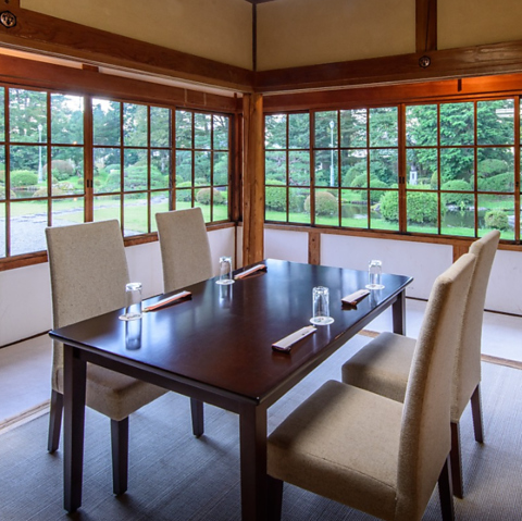 歴史を感じる庭園を望めるお座敷席やテーブル席は、落ち着いた雰囲気でご家族やご友人との語らいに最適です。木の温もり溢れる内装が料理を引き立て、プライベート感のある配置で周囲を気にせずお過ごしいただけます。四季折々の景観に包まれながら、伝統の味をゆっくりとご堪能ください。