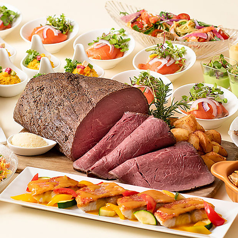 お肉料理も充実。ローストビーフはシェフがその場でカッティングサービスいたします。ライブパフォーマンスとともに、できたての味わいをお楽しみください。