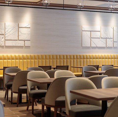 浦和の豊かな自然をコンセプトにしたダイニングエリア。幅広いレイアウトに対応した街とつながる明るい雰囲気と解放感あるダイニング席には、「埼大通り・別所沼公園などの自然」をモチーフにしたウォールアートのアクセントが洗練された雰囲気を作ります。