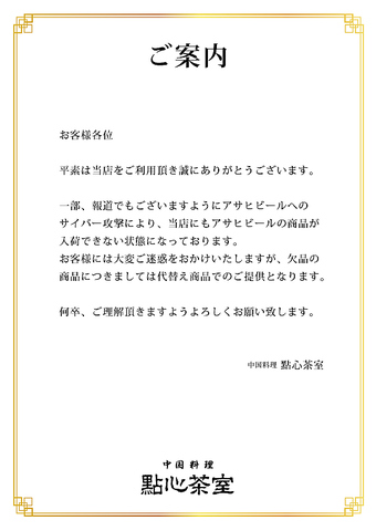 アサヒビール欠品のお知らせ