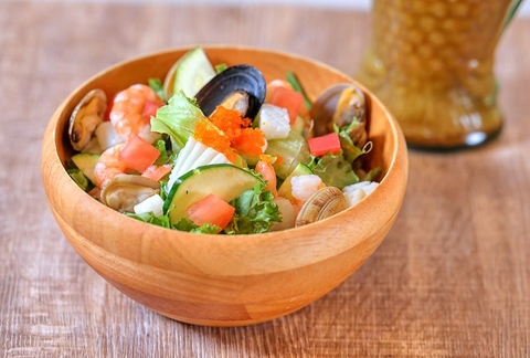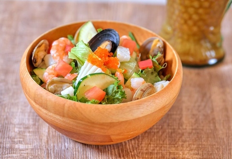 自慢の特製ドレッシングが好評。ぷりぷりのエビなどシーフードがたっぷり入っている。シャキシャキ野菜との相性◎