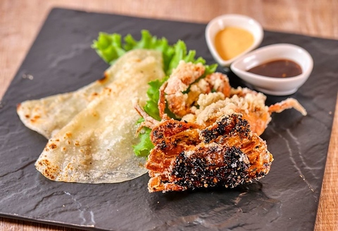 やわかいフライドカニを、特製ソー2種類と青菜をはさみ、薄いクラフトで巻いて手づかみで食べて頂きます。(ご注文は2ロールよりお願いします)※価格は1ロールです
