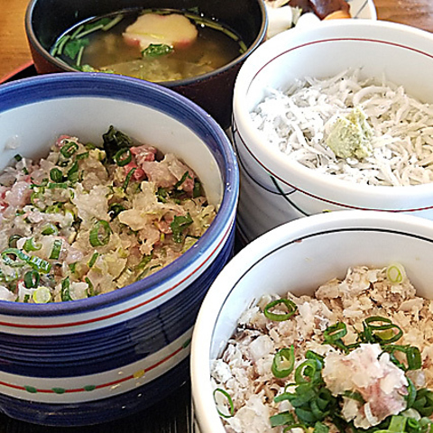 アジや桜えびなど、3種の丼を楽しめる大人気のセットメニュー。いろいろな味を少しずつ楽しみたい人におすすめ☆