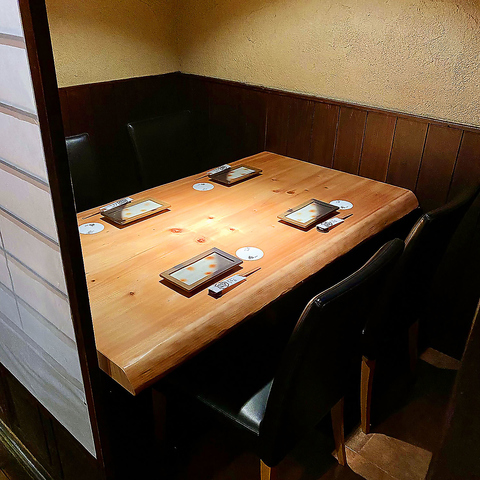 【テーブル個室・最大4名様】エアコン完備の個室は5部屋ご用意。3~4名様のご利用に最適な空間です。入り口部分の扉をお締め頂くと完全に他から見えないお席ですので、接待やビジネス、大切なゲストへのおもてなしに是非ご利用下さいませ。