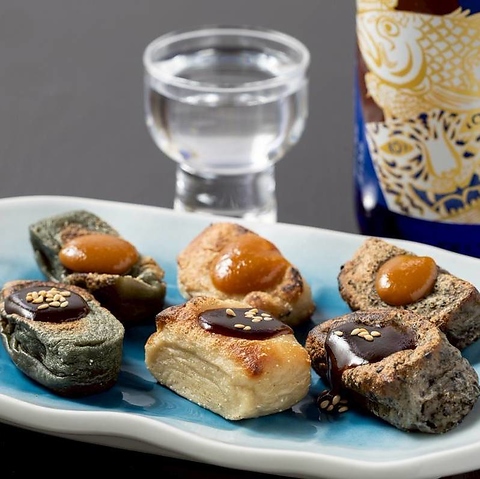 ごま・あわ・よもぎの生麩を焼き上げ二色の田楽味噌と柚子味噌をつけてお召し上がりください。