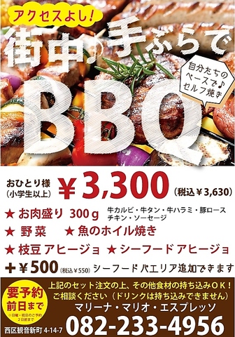 テラス席でセルフで炭火焼きBBQ。食材道具はご用意いたします。事前予約が必要ですのでお問合せください