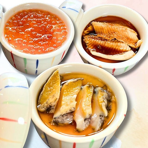 イクラ、穴子、あわびを豪快にのせた特製茶碗蒸し。スタンダードな茶碗蒸しも330円(税込)でご用意しております。