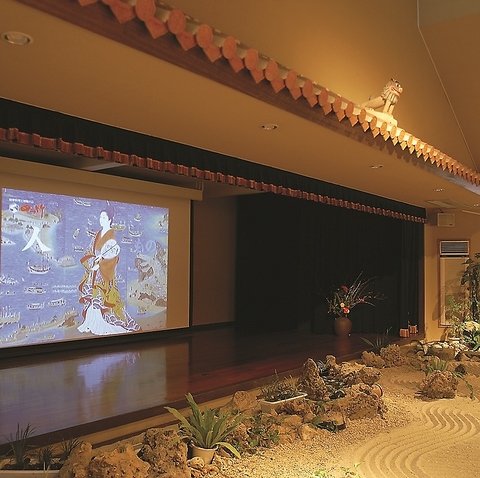 【2F個室席】琉球舞踊を演じるステージとお席の間には石庭がございます。沖縄の海に見立てた石庭が広がり、舞台やお料理を一層優美に引き立てます。古琉球へと遡る幽玄な時をお楽しみください。結納や接待、またお子様連れでもお気軽にご来店ください。