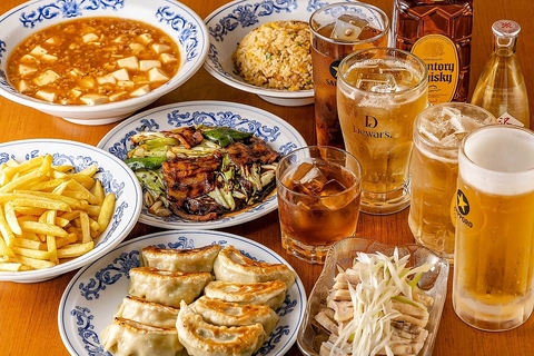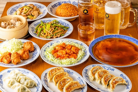 焼餃子3ケの他にもニラ焼餃子、キムチ餃子、チーズ揚げ餃子が各2ケ、その他にカニ玉やチャーハン、とりのからあげなど一品料理メニューも盛りだくさん◎全9品120分飲み放題がついて“3500円”とコスパ抜群!ボリューム満点のコースです。