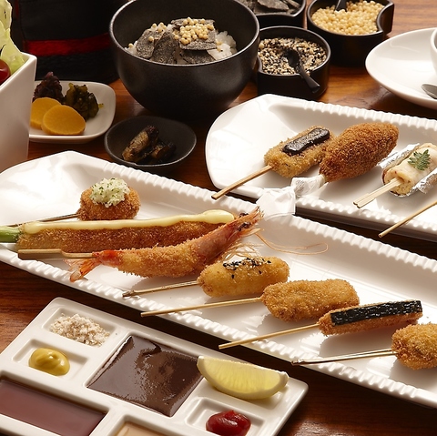 四季折々の串カツ約40種の中から、本日おすすめの串カツをお選びし、揚げたてにてお持ちいたします。伝統的な串カツの味わいを、心ゆくまでご堪能ください。※お召し上がりいただいた串の本数や種類により、ご会計金額は異なります。記載の金額は、串カツ十五種をお召し上がりいただいた場合のおおよその目安です。