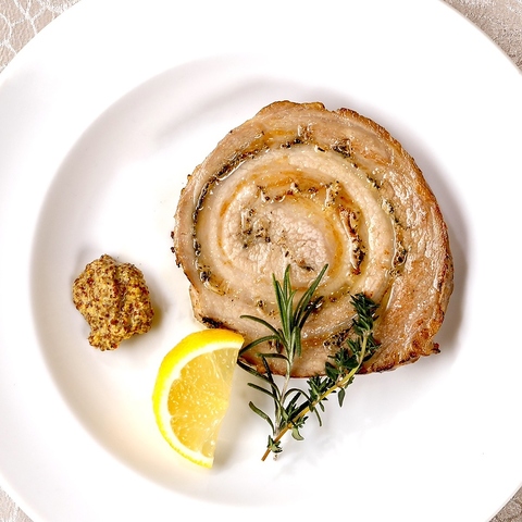 イタリア・ヴェネチアの郷土料理。三元豚の中にハーブを巻き込んだ香り豊かなローストポーク。