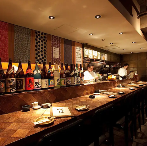 【カウンター席】 落ち着く雰囲気のカウンター席は語らいたい時にオススメ!旬の食材が並びます。会社帰りのサク飲みにも♪