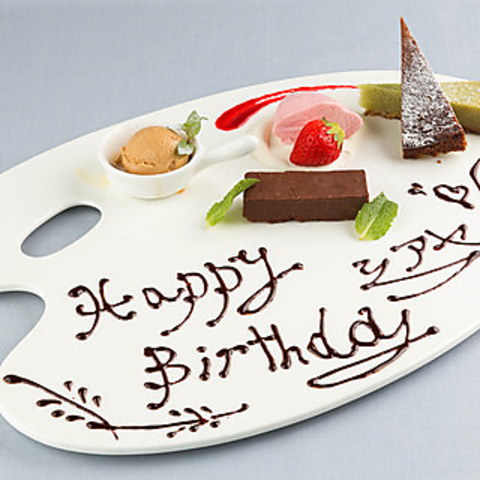 大切な方にサプライズはいかがでしょうか。シェフ特製のプレートはメッセージやお名前もお入れできますので心に残る最高の思い出をお手伝いいたします♪記念日や誕生日でご利用の際は予約時に是非お申し付けください。
