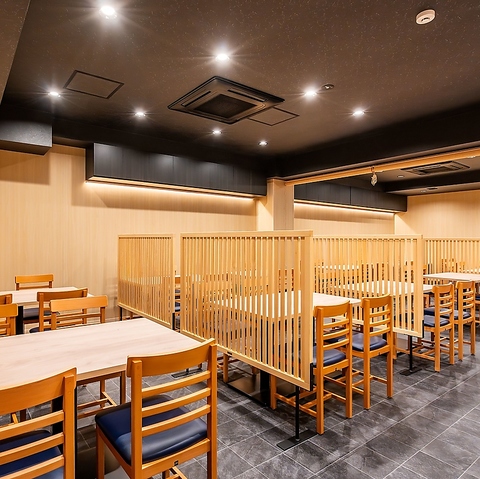 隣との間隔をしっかりと確保し、高い仕切りを設けたテーブル席は、仕事帰りの会食や打ち合わせにも最適。清潔感あふれる明るい木目と、洗練された黒の天井が織りなす空間が、上質なひとときを演出します。お一人様から少人数グループまで、日常を忘れてリラックスできるお席をご用意しております。