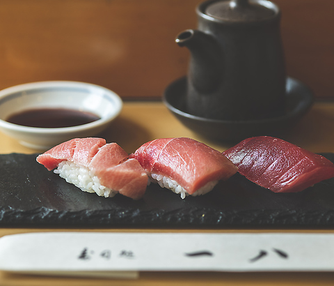 カウンター越しに、板前との会話も楽しんで頂く為、一八のカウンターにはメニューが置いてありません。板前がメニューです。お薦めのネタは?1人前ずつ握って、おまかせで、…等。目の前の板前に伺ってください。