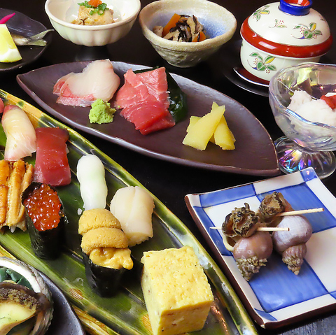 旬の食材を贅沢に使った「旬彩おまかせコース」は季節の移ろいを舌で感じていただけます♪お通しに始まり、鮮やかなお造り、香ばしい焼き物、大将が心を込めて握る旬の握り10貫、お椀の全5品をご用意◎その日の仕入れで内容が変わることも、訪れるたびの楽しみです。他にも日本の四季を感じる料理をコースでもご堪能下さい。
