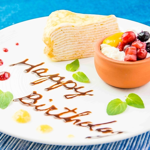 お祝いや記念日、誕生日などにぴったりのパーティプレートをご用意しております♪お一人様+330円(税込)で、『本日のデザート』から『パーティプレート』に変更可能です!デートや女子会など様々なシーンでご利用ください!※本日のデザートがついたコースをご予約のお客様が対象です。※写真は一例です。