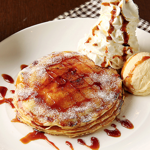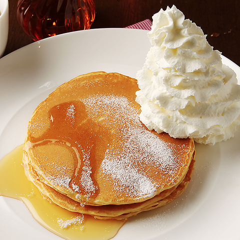 ふわふわ生地のパンケーキに軽~いホイップクリームをたっぷりトッピング。メープル、ココナッツシロップをたっぷり掛けてお召し上がりください。