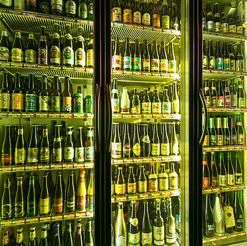 カウンター席のすぐ横には、120銘柄以上のボトルビールが並ぶ大きな冷蔵庫が!お好みのビールを選びながら、気軽に一杯楽しめます♪