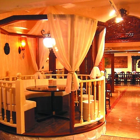 【半個室風のくつろぎ空間】白いレースのカーテンに囲まれた、プライベート感のある円卓席は、デートや女子会、記念日利用にぴったり。柔らかな照明とクッション付きのソファ席が、ゆったりとした時間を演出します。ナタラジの自然派インド料理を、落ち着いた雰囲気の中でじっくり味わえる人気のスペースです。