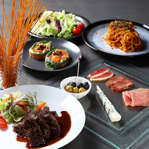 【ボリューム満点お料理&飲み放題付き5000円(税込)のオトクなコース!】サラダ・ブルスケッタ・ハラミステーキ・生ハム3種・選べるパスタの全5品+飲み放題(生ビール・ワイン・焼酎・カクテルなど種類豊富)・カラオケ歌い放題がついた宴会向けのオトクなコース!8名様以上のご予約で使えるオトクなクーポンも配信中です★