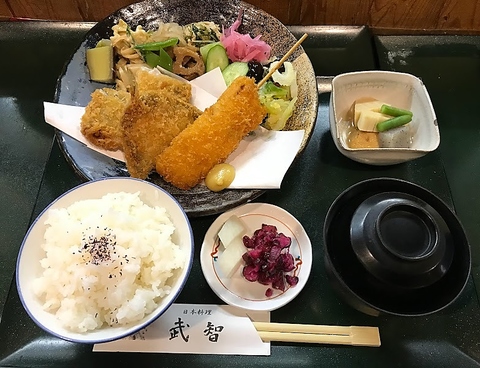 ランチ: 定食1000円(税込)。刺身定食をはじめ、アジフライ定食、豚カツ定食、武智弁当、鶏南蛮漬け定食、何を食べても美味しいと評判です。最近特に人気があるのは、刺身定食、アジフライ定食です。定番の武智(たけち)弁当は盛り付けお時間が掛ります