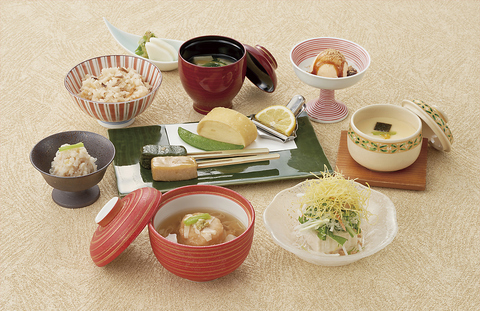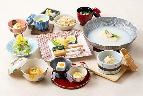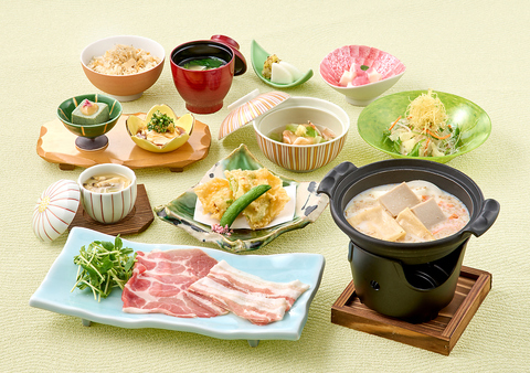 ◆小鉢2種◇茶碗蒸し◆豆腐サラダ◇名物とうふしゅうまい◆蓮根まんじゅう◇湯豆腐◆生麩田楽◇湯葉揚げ◆湯葉吸物◇季節の飯物◆香の物◇デザート