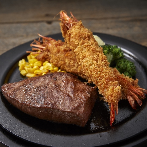 サクサク衣のエビフライと濃厚な旨味を感じるミスジステーキの組み合わせです。