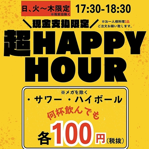 日、火~木限定でサワー・ハイボールが驚異の100円(税抜)?!