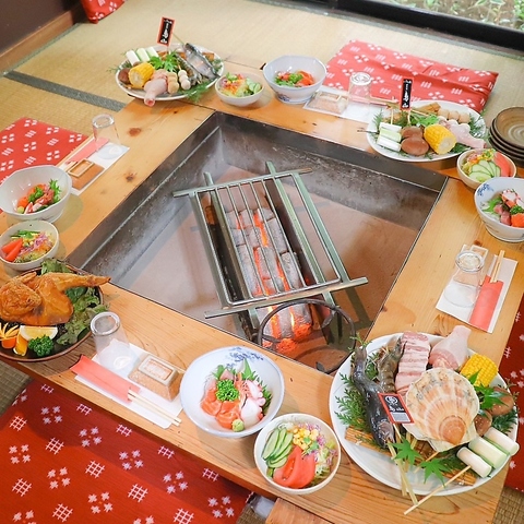 離れの個室でのいろり焼は、いわば日本古来の和風日帰りグランピング。体験型のお食事をお楽しみください♪
