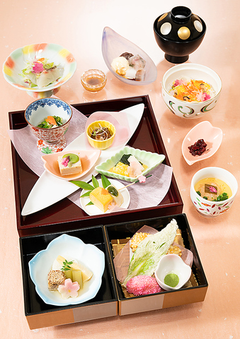 《2026年4月15日(水)までの期間限定メニューです。この機会に是非ご利用ください。》季節の前菜(春野菜のお浸し)、煮物(炊き合わせ)、揚げ物(季節の変わり揚げ)、蒸し物(道明寺茶碗蒸)、サラダ(桜鯛のサラダ)、お食事(桜御飯)、甘味(ミニクリームあんみつ)