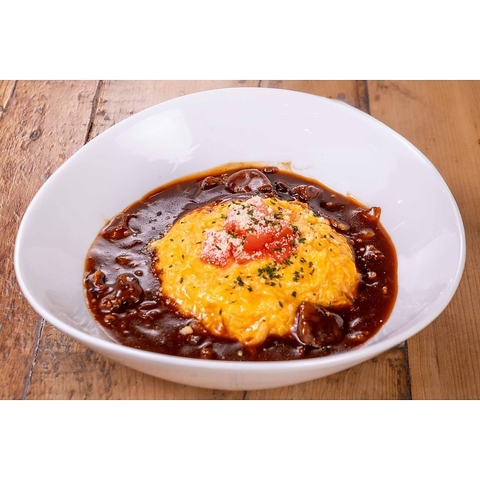 お子様から大人までみんな大好オムライス♪ 牛バラのブロックとスライスの2種類のカットの肉をじっくり煮込んだハッシュドビーフを白米にチーズをのせてフワフワ玉子と組み合わせたオムライスです。