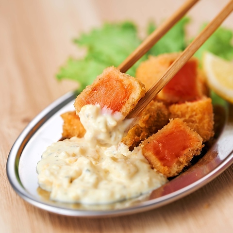 タルタル/わさびポン酢のどちらかをお選びいただけます。特製!サクサクの香ばしい衣にレアな食感のサーモン