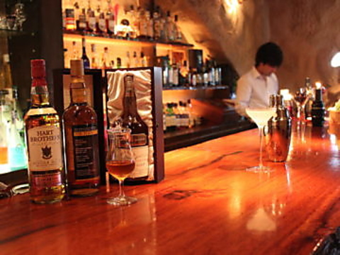 洞窟をイメージした店内に、ロングカウンターがゆったりと備わり、オーセンティクバー(本格BAR)の雰囲気。