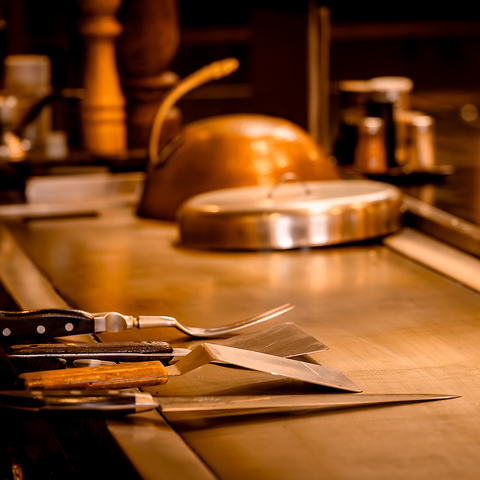 目の前で繰り広げられる迫力の調理風景をぜひお楽しみください!鉄板の上でジュウジュウと焼かれる食材の香ばしい香りとともに、焼きあがる瞬間を体感できるのがこのスタイルの醍醐味です♪シェフの熟練した包丁さばきや火の勢いを巧みに操るパフォーマンスは、まるで一つのショーのよう。五感で楽しむ、心に残る特別な体験をお届けします。