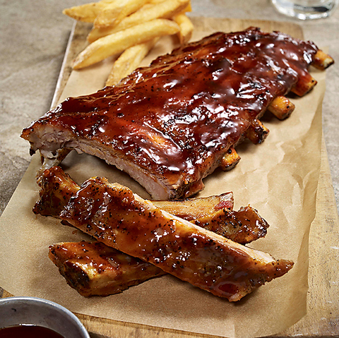 脂身が少ないフランス産のポークリブは、柔らかく骨から簡単にほぐれる逸品。フライドポテトとコールスロー付き。