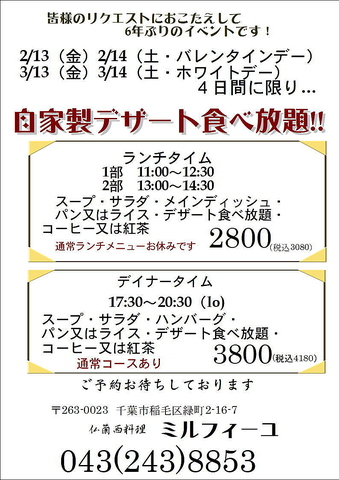 2/13・2/14(バレンタインデー)・3/13・3/14(ホワイトデー)の4日間に限り自家製デザート食べ放題!