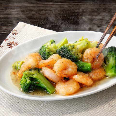 人気メニュー♪海老とブロッコリー塩炒めは彩りもきれいであっさり塩味。いちげんの中華は長くお客様から愛されています。