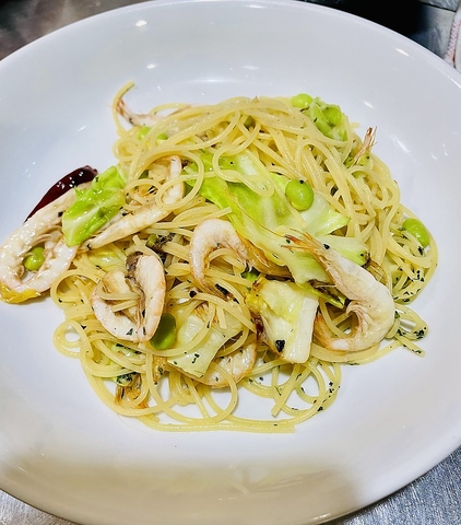 本日のパスタ 白海老とグリンピースのペペロンチーノ
